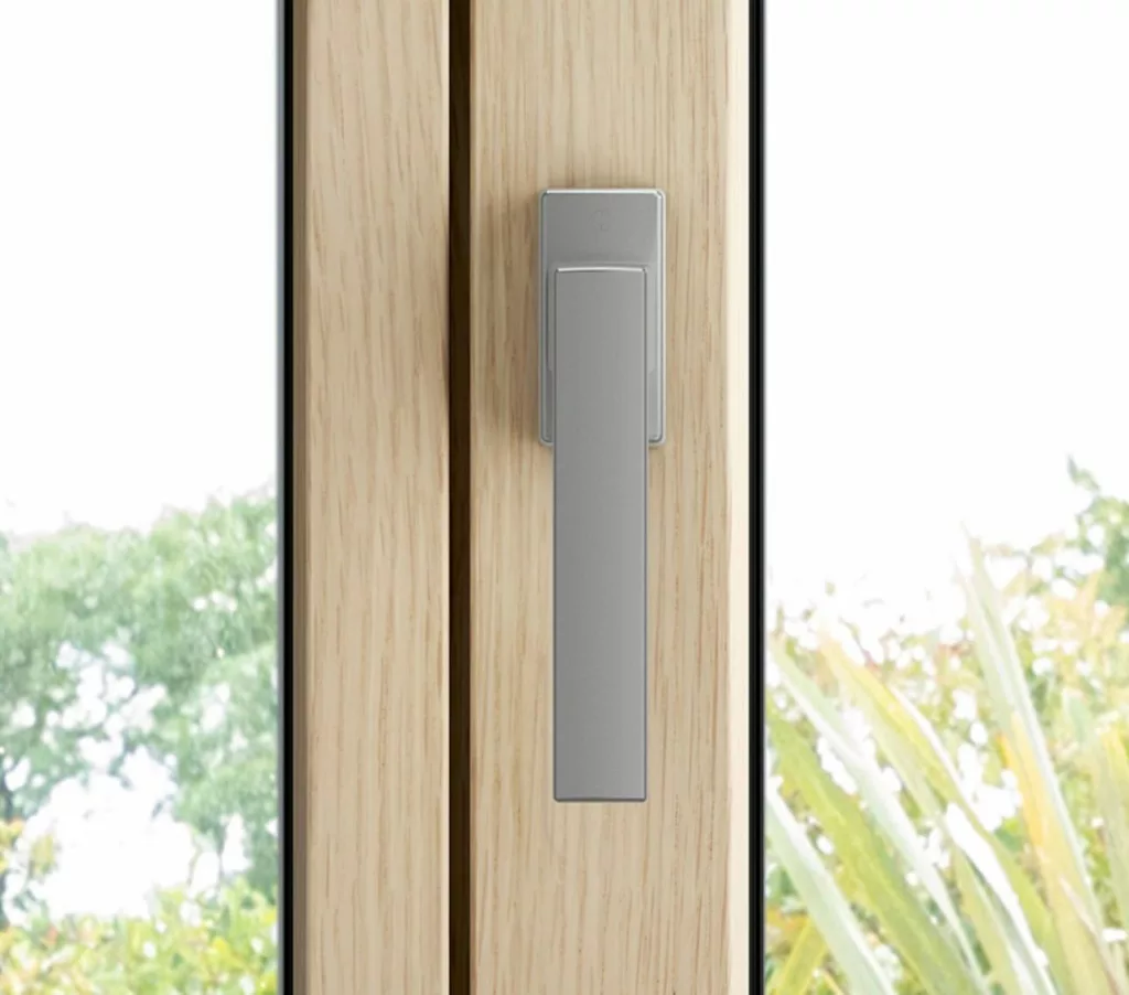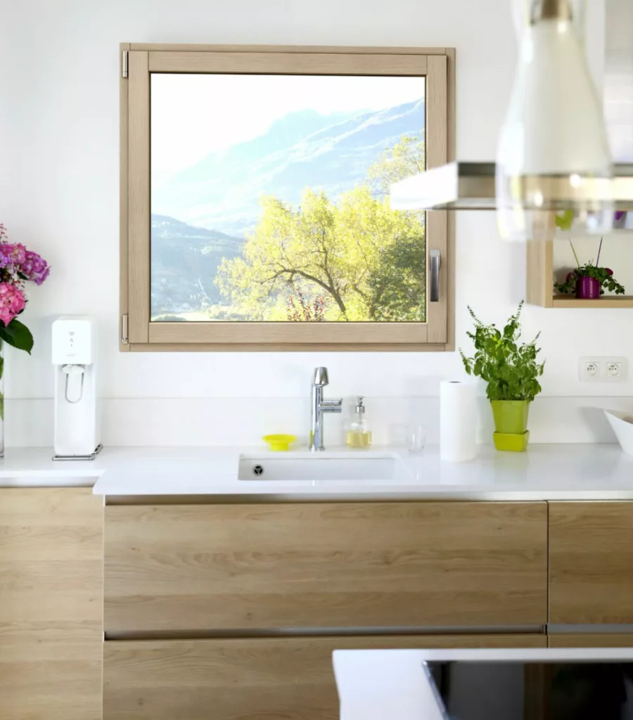 La parfaite séparation des matériaux – aucun contact entre le bois intérieur et l’aluminium extérieur – empêche la conduction thermique. Cette technologie, renforcée par un cadre thermique intégré à l’ouvrant, un profilé à rupture de pont thermique sur la pièce d’appui et deux joints d’étanchéité, limite efficacement les déperditions de chaleur et évite les phénomènes de condensation.